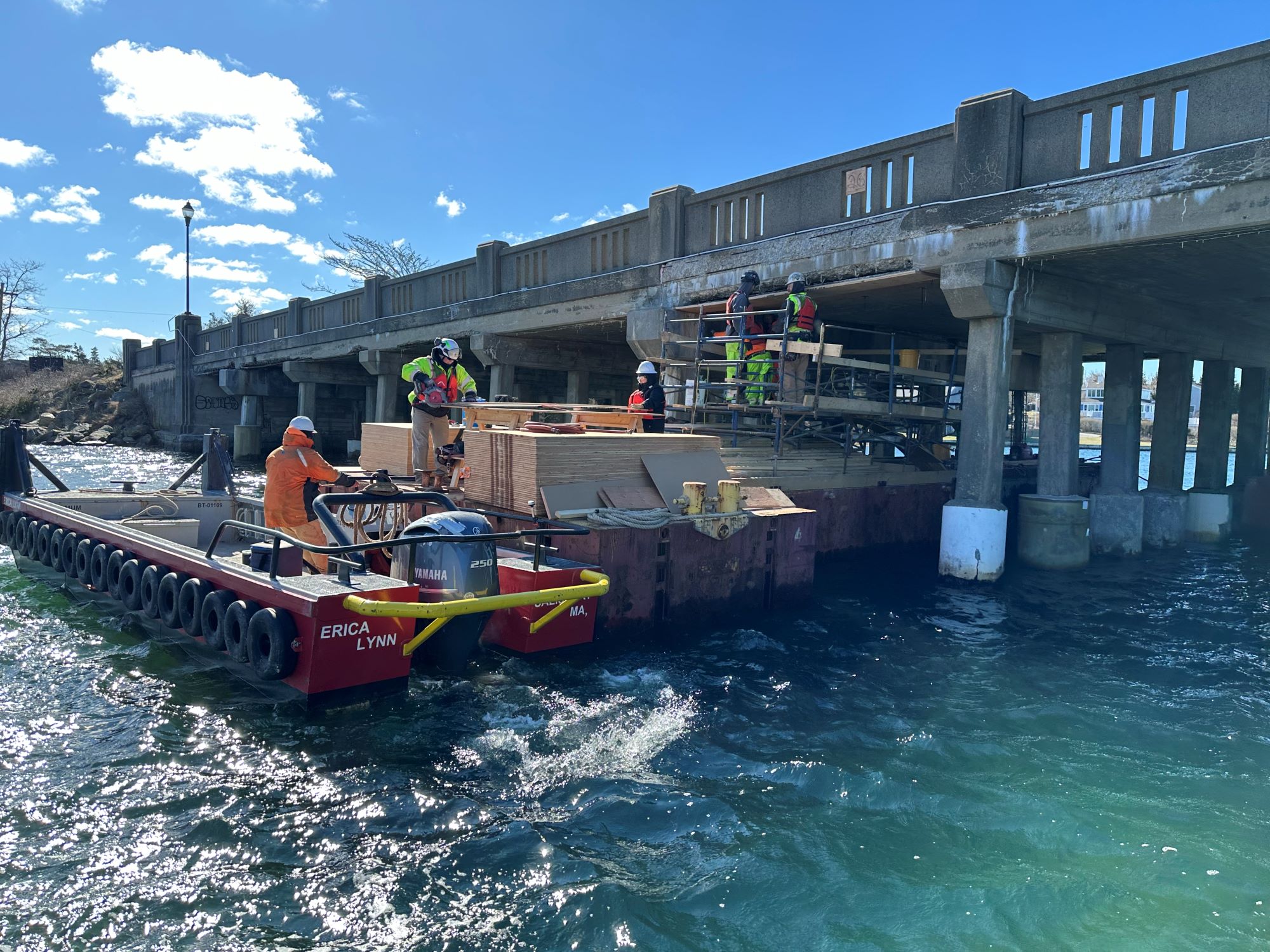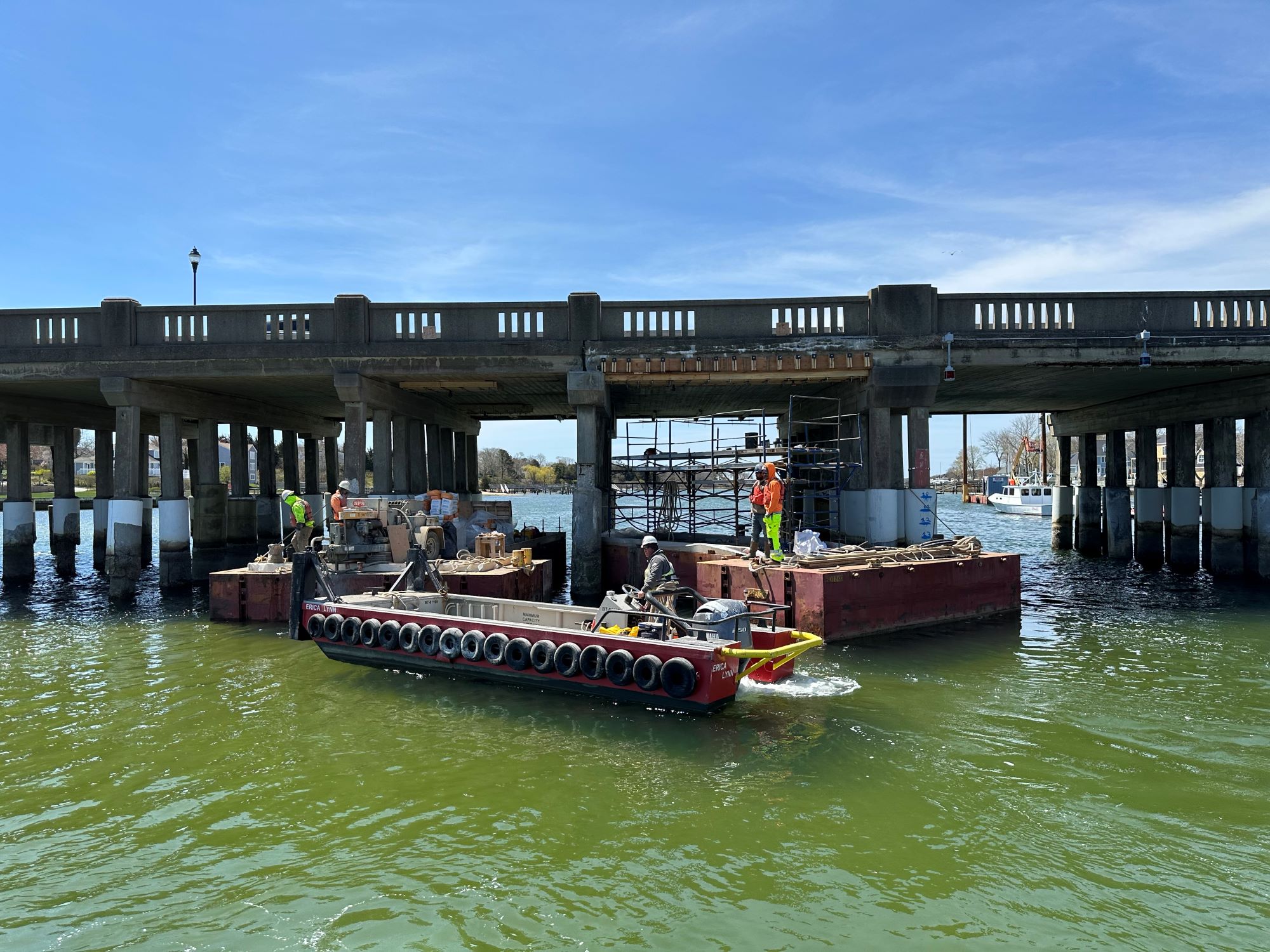 SPS recently completed high priority overhead concrete and pile repairs at the Bass River Bridge in Yarmouth. Tight access, tides, growing repairs, and an expedited repair schedule made this project a challenge for everyone involved. The project started in January and was completed a few days prior to the Fourth of July weekend. It took a huge effort from SPS Superintendents, Foreman, Labor, Operations, Marine Division and Project Management . Mark Rousseau (Site Superintendent) was supported by Joe Harvey, Joe Ford, Nick Terenzoni, Ben Terenzoni, Jimmy Zechello, John Desimone, Jason Williams, Jeremiah Connolly, Chris Pickford, and very determined crew. Congratulations to everyone who made this one a success.